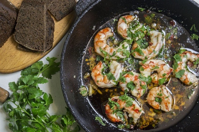 Разогрейте сковороду, добавьте оливковое масло. Обжарьте измельченный чеснок и чили до появления аромата (около 1 минуты). Добавьте креветки, готовьте 3–4 минуты, помешивая, пока они не станут розовыми. Сбрызните лимонным соком, добавьте нарезанную петрушку. Подайте горячими с кусочком багета.